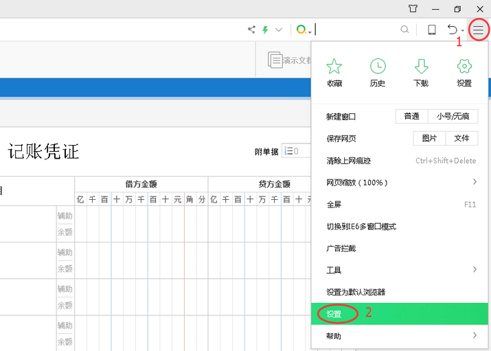 2.若使用360安全浏览器,打开“凭证录入”页面,没有出现上图提示时,请按如下顺序操作: