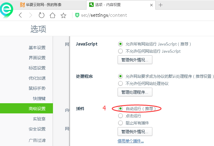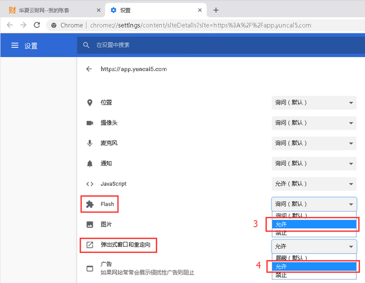 ②接下来设置【Flash】插件选项为“允许”;同时顺便设置【弹出式窗口和重定向】选项为“允许”,这个解决打印拦截的问题。