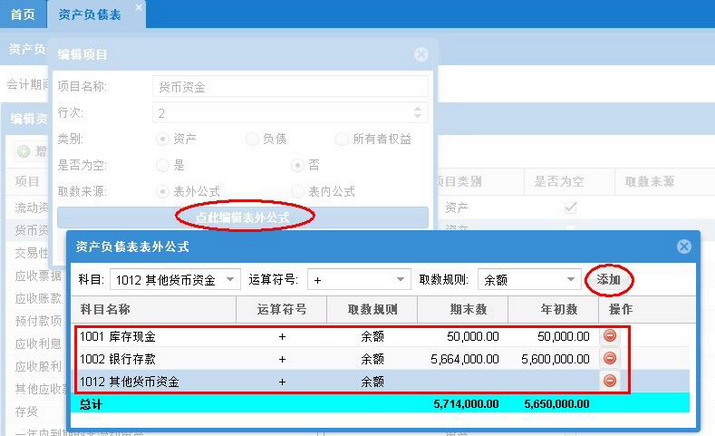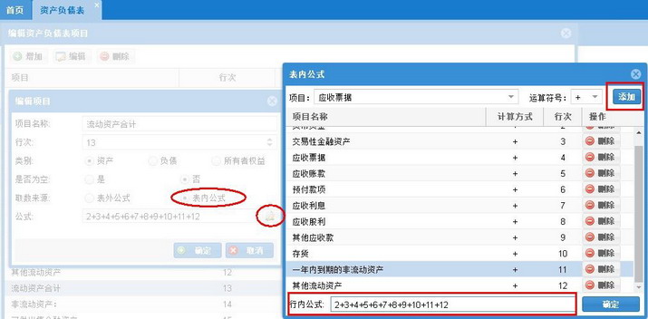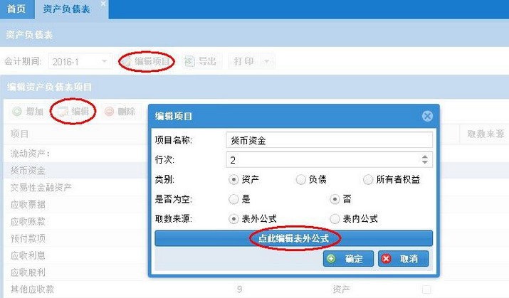 【资产负债表--编辑项目】 → 选择表项目 → 点击【编辑】按钮 → 设置公式属性。