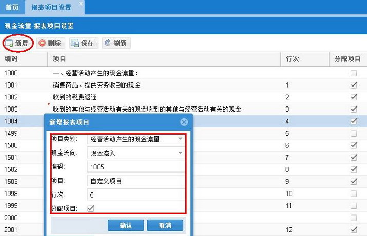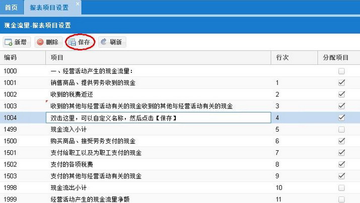 【现金流量表--报表项目】 → 双击项目名称,即可自定义名称。