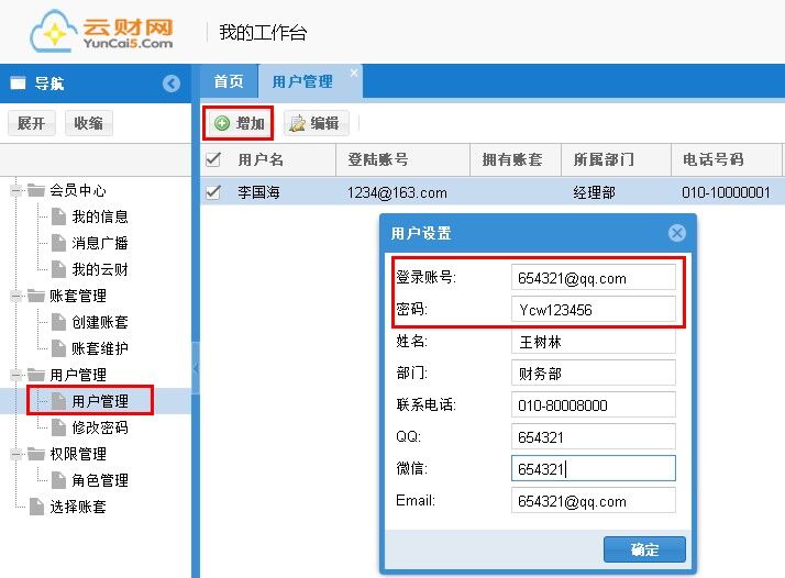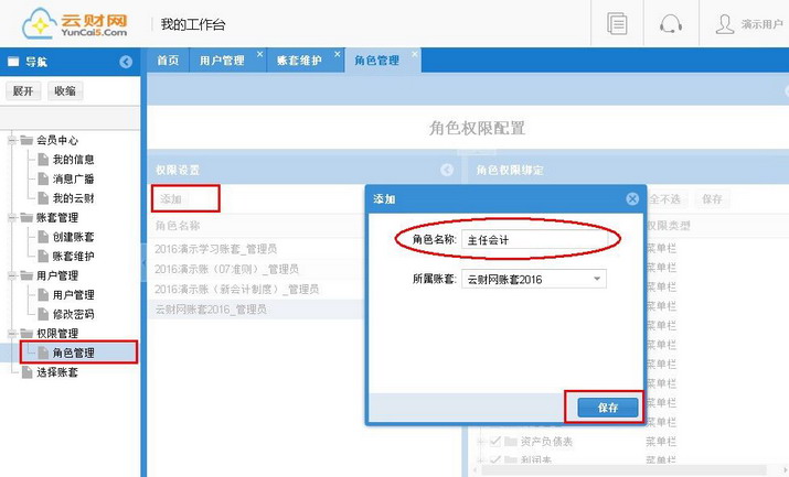 如果提示“成功”,则“王树林”登录云财网后,可以选择账套[云财网账套2016]登录,但此时王树林只能登录,还不具有该账套的任何操作权限。需要继续下一步给他分配相应的权限角色。 3.添加角色