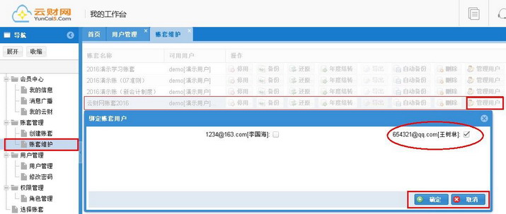 【我的工作台--账套维护】 → 选择要分配给“王树林”做账的账套[云财网账套2016] → 点击【管理用户】按钮 → 在弹出的选择页面 → 选择上“王树林” → 点击【确定】。
