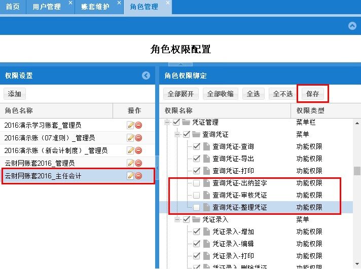【我的工作台--权限管理--角色管理】 → 点击【添加】按钮 → 角色名称,输入“主任会计” → 所属账套,选择[云财网账套2016] → 【保存】 → 选择新添加的角色名称[云财网账套2016_主任会计] → 右侧权限节点树形结构表中所有节点默认为空 → 把需要授权给主任会计的权限节点打勾 → 把不需要授权的审核、签字等权限留空 → 【保存】。