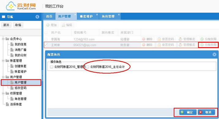 【我的工作台--用户管理】 → 选择“王树林” → 点击【分配权限】 → 在角色列表中,选中[云财网账套2016_主任会计]角色 → 【确定】。这样,管理员完成了对“王树林”会计的权限分配。