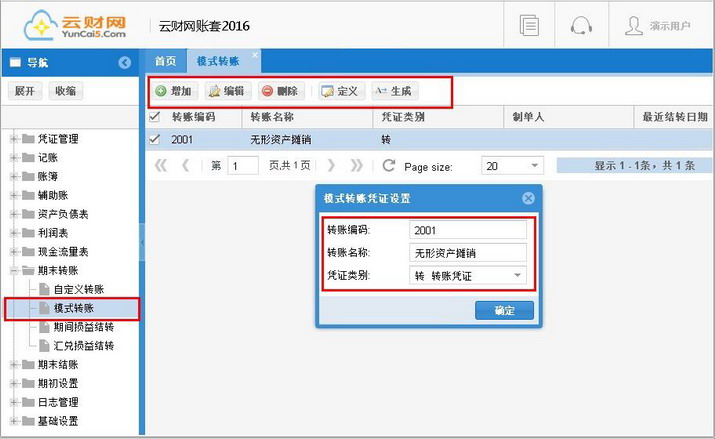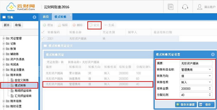 模式转账,一般用于固定会计科目、固定金额的结转,可定义结转关系,转账金额可以直接确定输入。