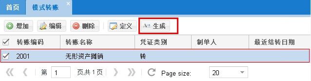 【期末转账--模式转账】 → 选择要生成的凭证名称 → 点击【生成】按钮 → 即可生成按定义组成的转账凭证。