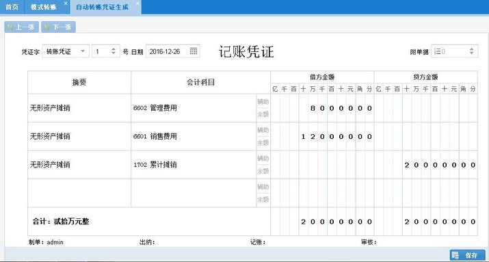 【期末转账--模式转账】 → 点击【增加】按钮 → 输入转账凭证编码[2001]、名称[无形资产摊销],选择凭证类别 → 点击【确定】。 2.定义转账凭证的会计分录,并设置会计科目的计算公式