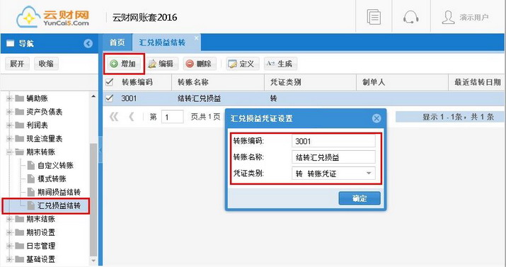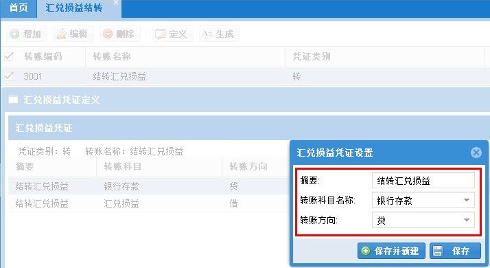 【期末转账--汇兑损益结转】 → 点击【增加】按钮 → 输入转账凭证编码[3001]、名称[结转汇兑损益],选择凭证类别 → 点击【确定】。 2.定义转账凭证的会计分录,并设置会计科目的计算公式