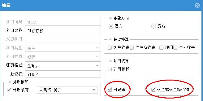 如需查询科目日记账,首先设置您要查看的会计科目的属性。即,会计科目中的[日记账]选项。