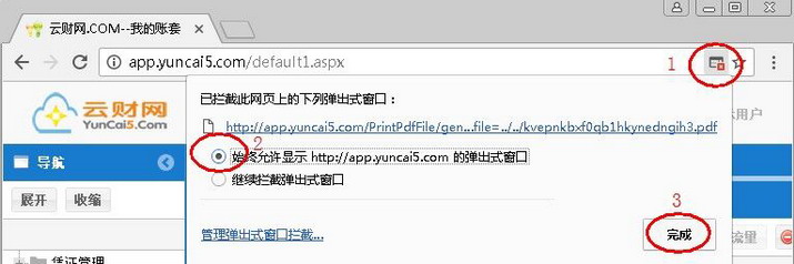 如下图,是谷歌浏览器的解决方法:于浏览器地址栏右侧点击拦截提示图标 → 选择“始终允许显示http://www.yuncai5.com的弹出窗口” → 【完成】
