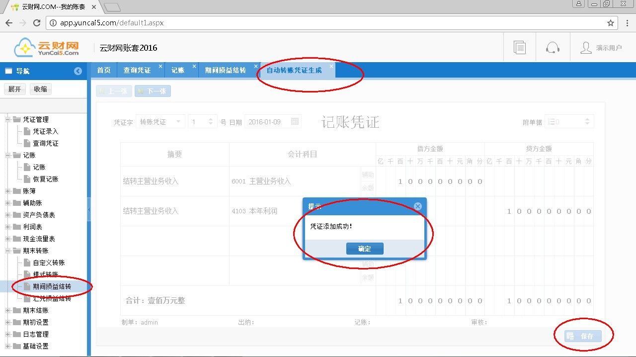 云财网在线会计的期末转账,主要分四个类别:自定义转账、模式转账、期末损益结转和汇兑损益结转。