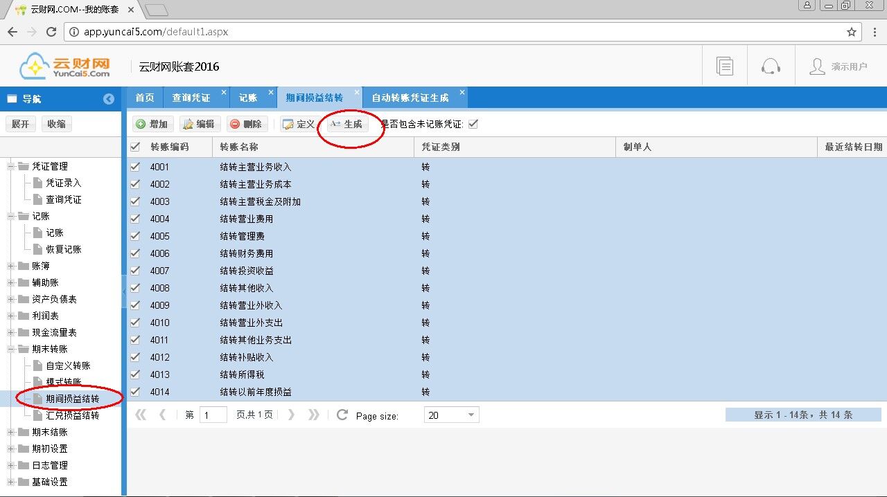 默认情况,系统自动生成期间损益需要结转的凭证项目。用户只需按实际情况勾选相关凭证项目,执行【生成】即可。