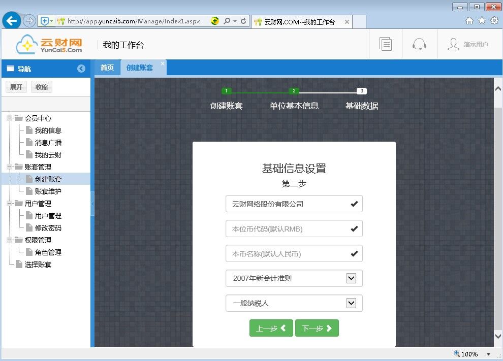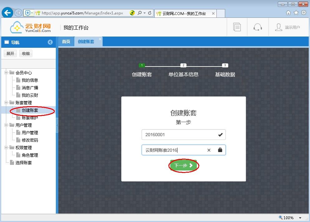 【我的工作台--账套维护--创建账套】→ 输入账套编号与名称→ 单位名称、所用会计制度和税务规模(默认本位币代码和名称可以不写)→ 数据小数位数默认是2位,账套默认开始年度为当年、默认开始期间1月,会计科目编码级次及各级编码长度可以不用输入、使用默认值→【提交】成功后选择新建的账套名称登录